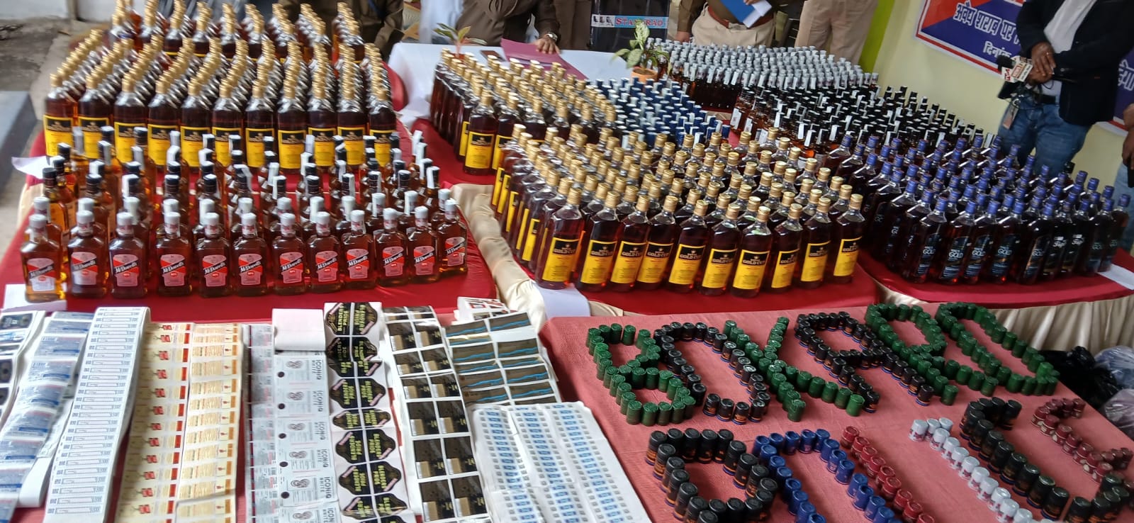 जप्त वाहन (रजिस्ट्रेशन नंबर JH01CX-7876) से विभिन्न ब्रांड की बड़ी मात्रा में नकली विदेशी शराब, शराब सील करने की मशीन, ढक्कन, स्टीकर, बारकोड और स्पिरिट बरामद की गई। बरामद शराब में किंग्स गोल्ड (72 बोतल), रॉयल गोल्ड कप व्हिस्की (300), आइकॉनिक 180 एमएल (136), आइकॉनिक 375 एमएल (48), मैकडॉवेल्स 180 एमएल (192), मैकडॉवेल्स 375 एमएल (24), बी-7 (48) सहित करीब 20 लीटर तैयार शराब और 35 लीटर स्पिरिट शामिल है। इसके अलावा विभिन्न कंपनियों के सैकड़ों ढक्कन, स्टीकर और 2250 बारकोड भी जब्त किए गए।